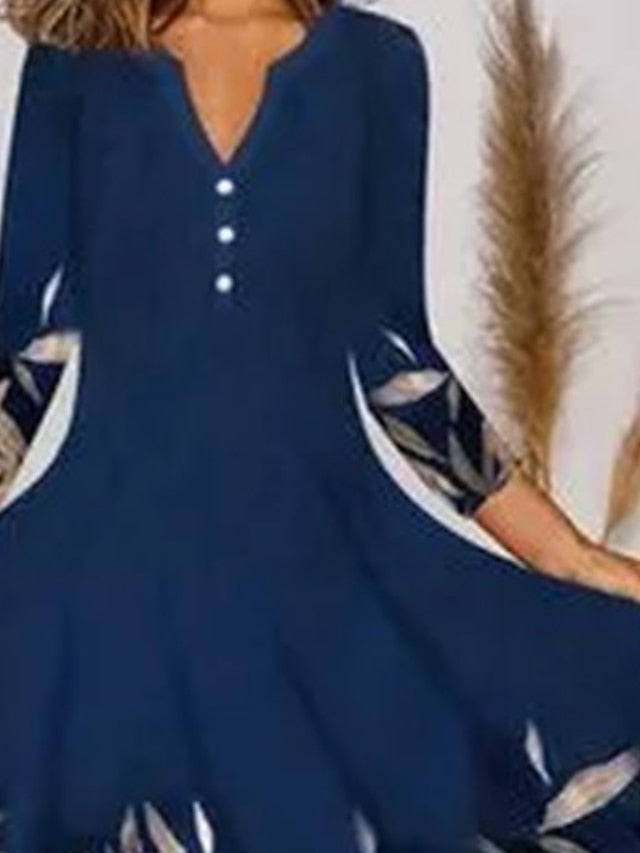 A Line Dress Midi Dress Dark Blue Long Sleeve Floral Print Summer Spring V Neck Casual Winter Dress Fall Dress S M L XL XXL 3XL for Women