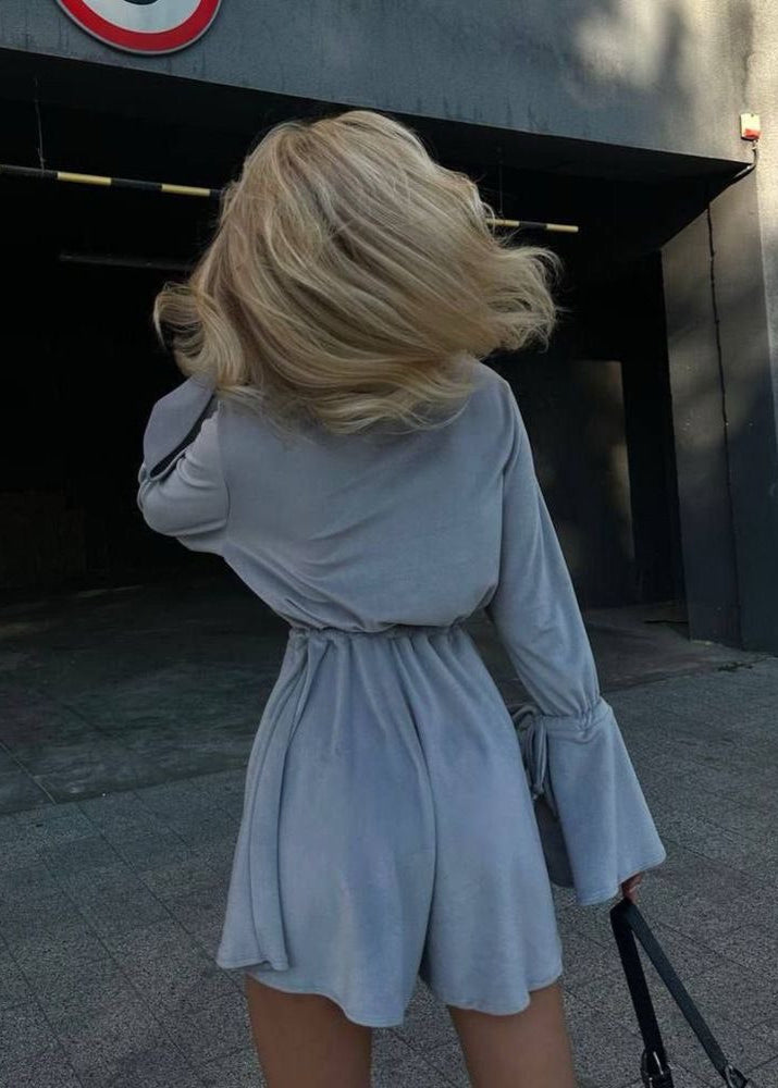 Ashbell Tie Waist Romper – Gray Flared Sleeve Mini Jumpsuit