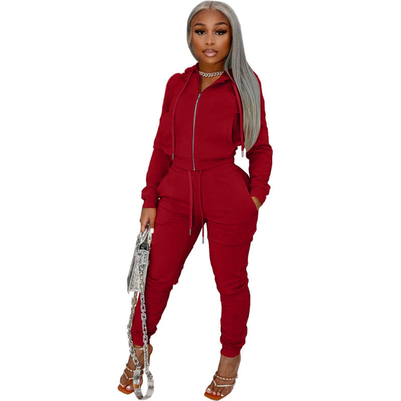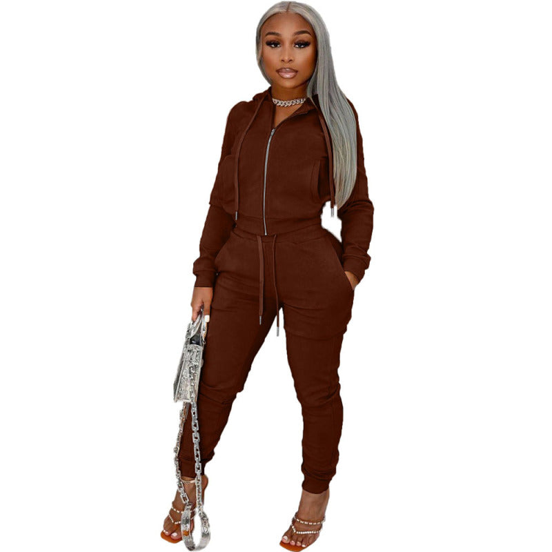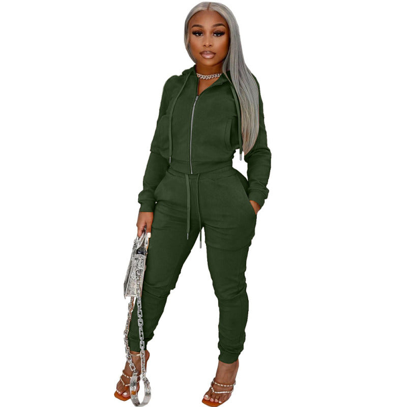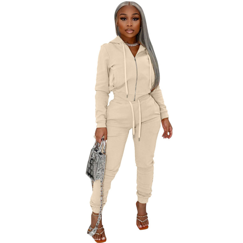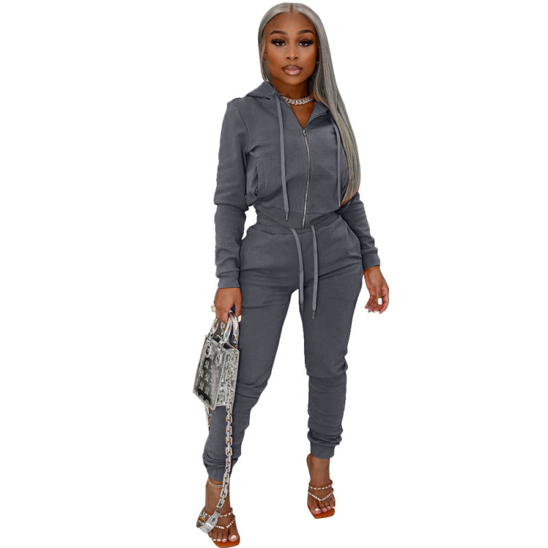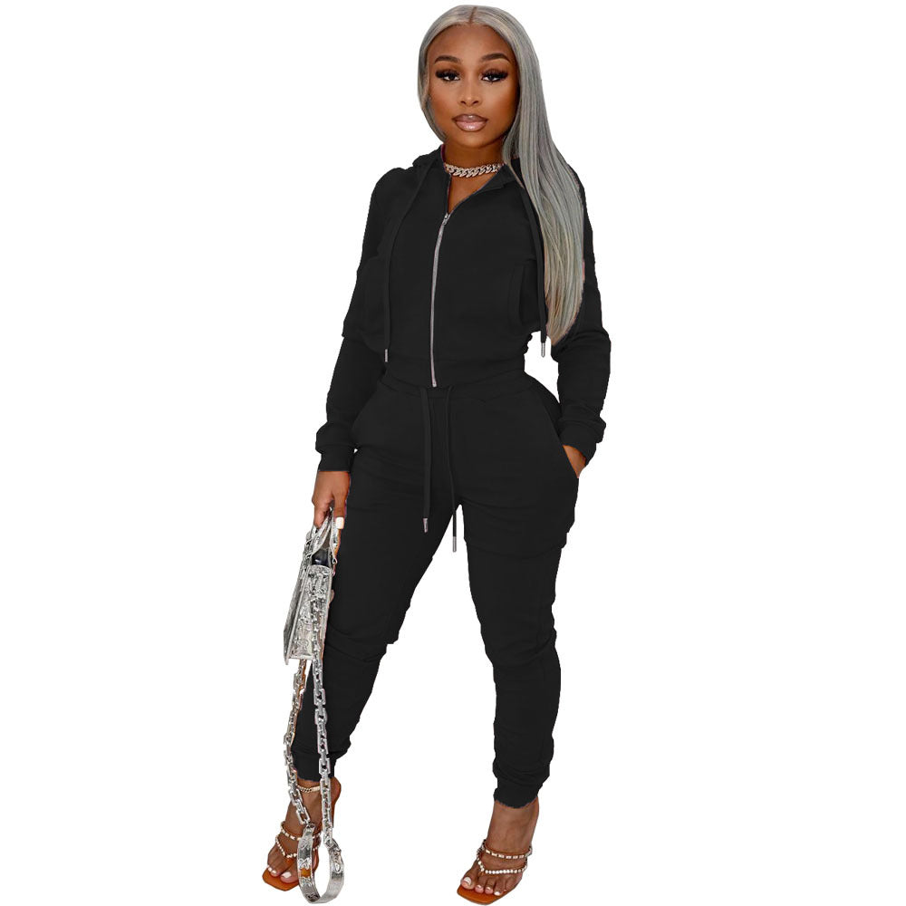 Conjunto deportivo informal de top y pantalón de manga larga con capucha y cremallera de color liso para mujer