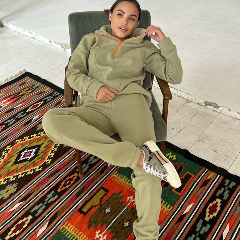 Conjunto de dos piezas de suéter y pantalones de manga larga con cremallera y solapa informal para mujer Otoño Invierno
