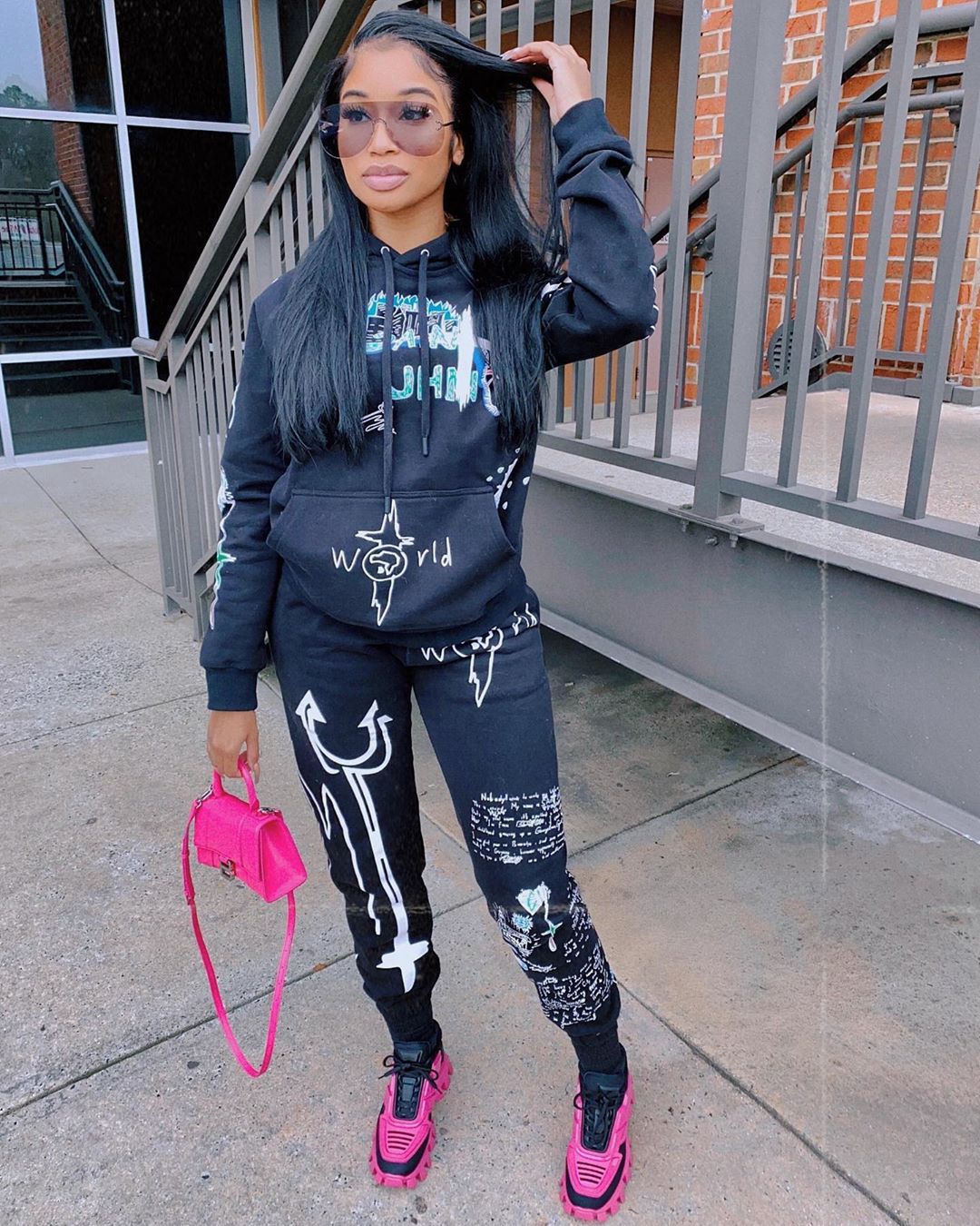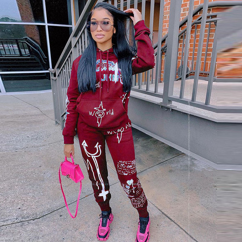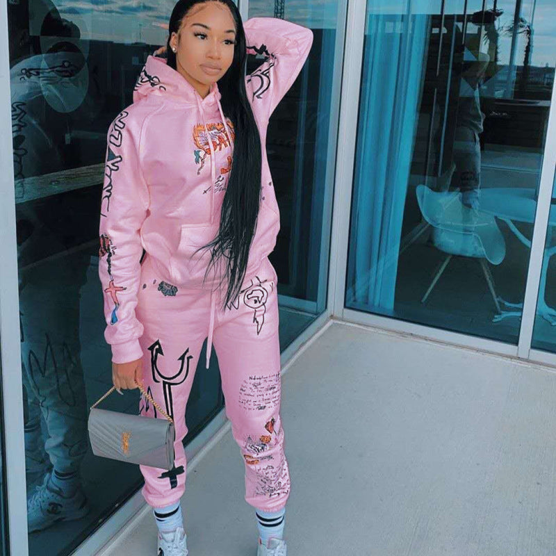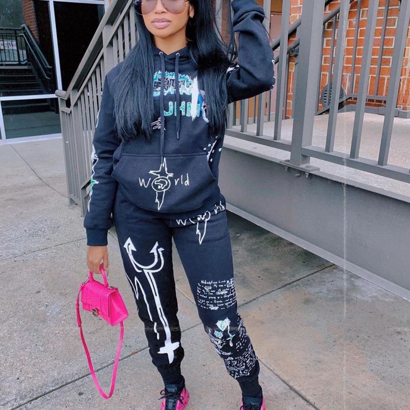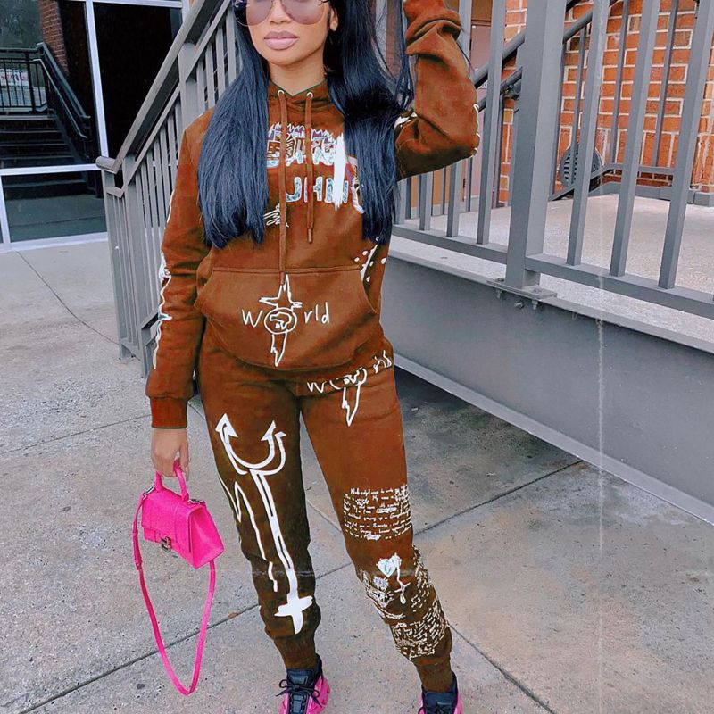 Conjunto de dos piezas de suéter y pantalones con capucha y estampado informal para mujer, moda Otoño Invierno
