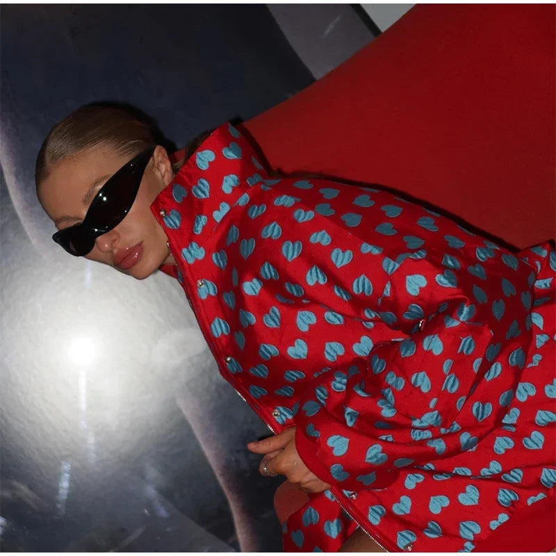 Conjunto de dos piezas formado por chaqueta, top y falda, manga larga, con cremallera y estampado de corazón, para mujer