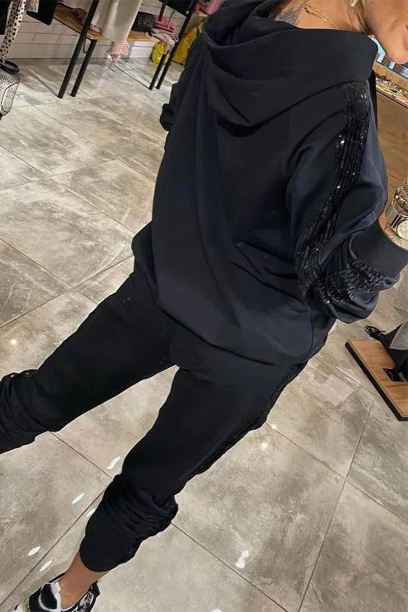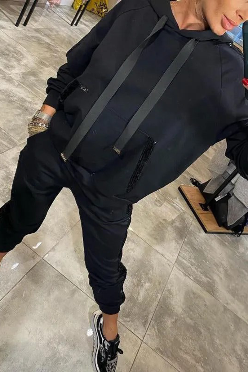 Casual Daily Sequins Draw String Pocket Hooded Long Sleeve Two Pieces(5 Colors)