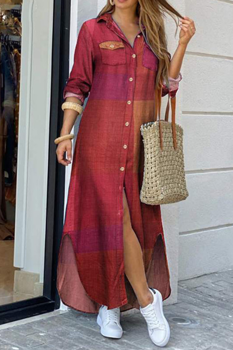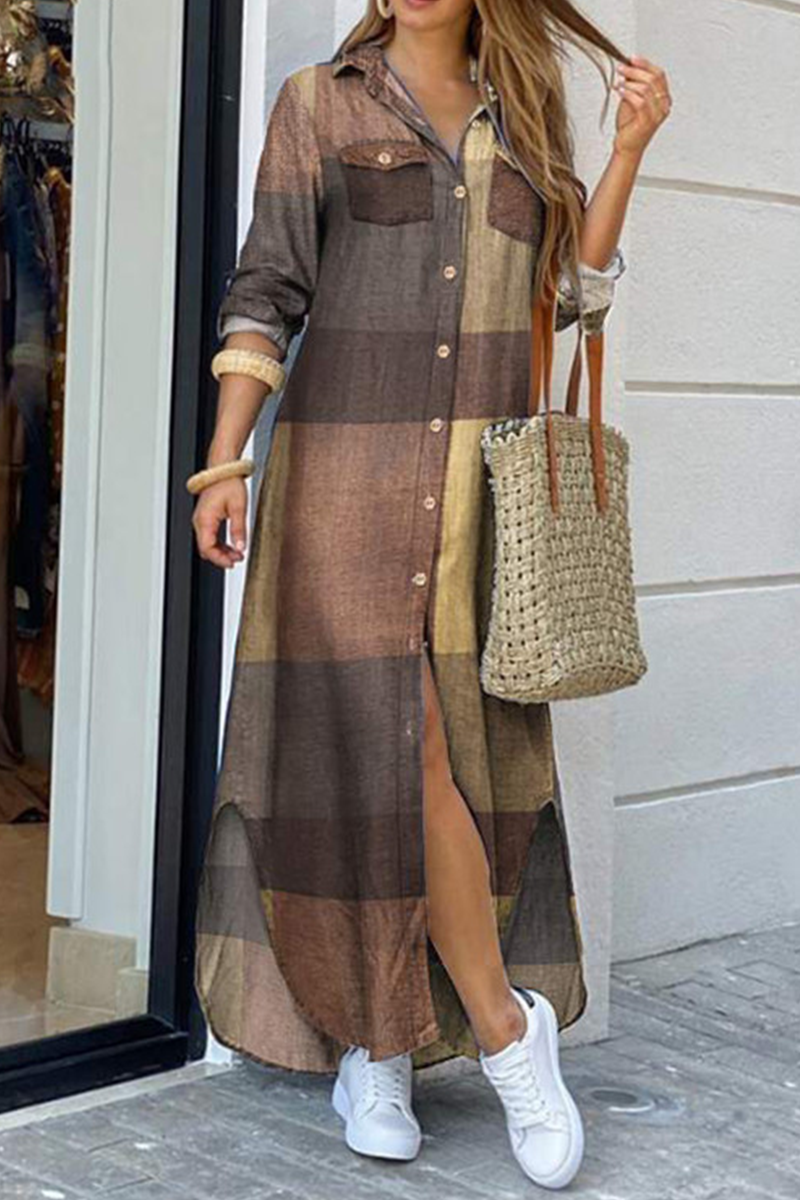 Casual Plaid Pocket Buckle Shirt Collar A Line Dresses(4 Colors)