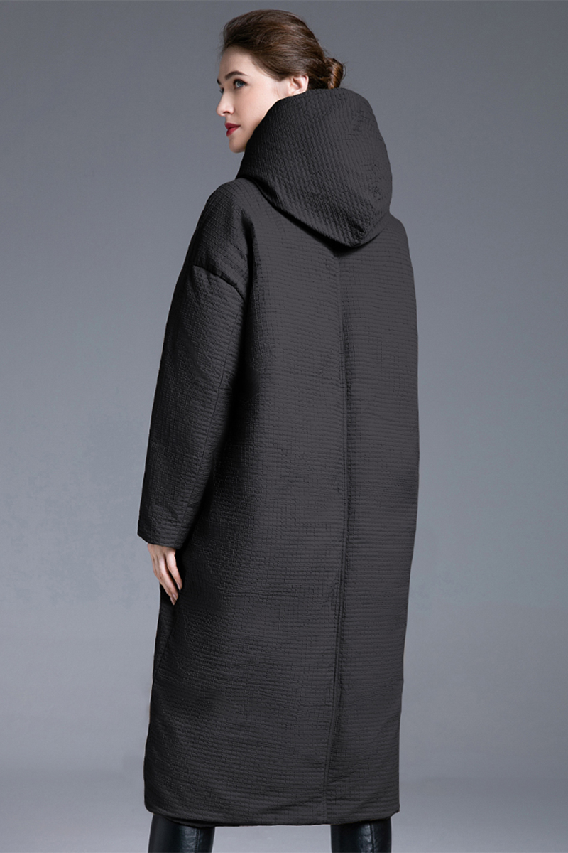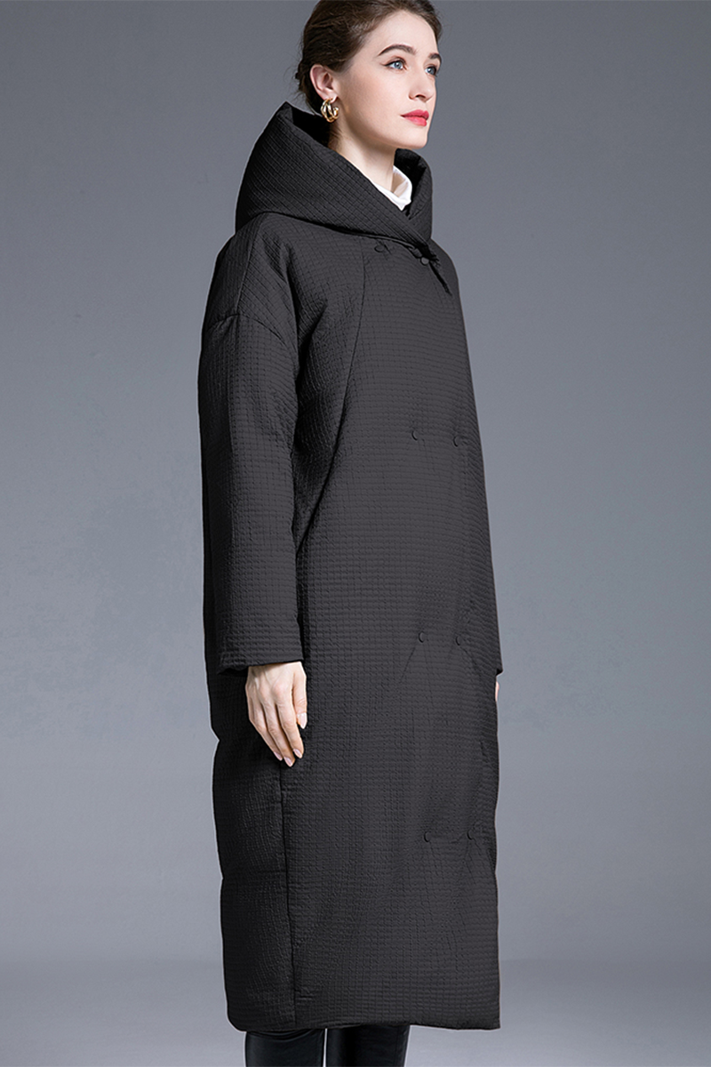 This is a cocoon shaped knee length down jacket. The hood has a pocket commuting style. White duck down filling, with a down content of 86% -90%, and a down weight of 301-350 grams. Comfortable and casual. There are two colors to choose from.