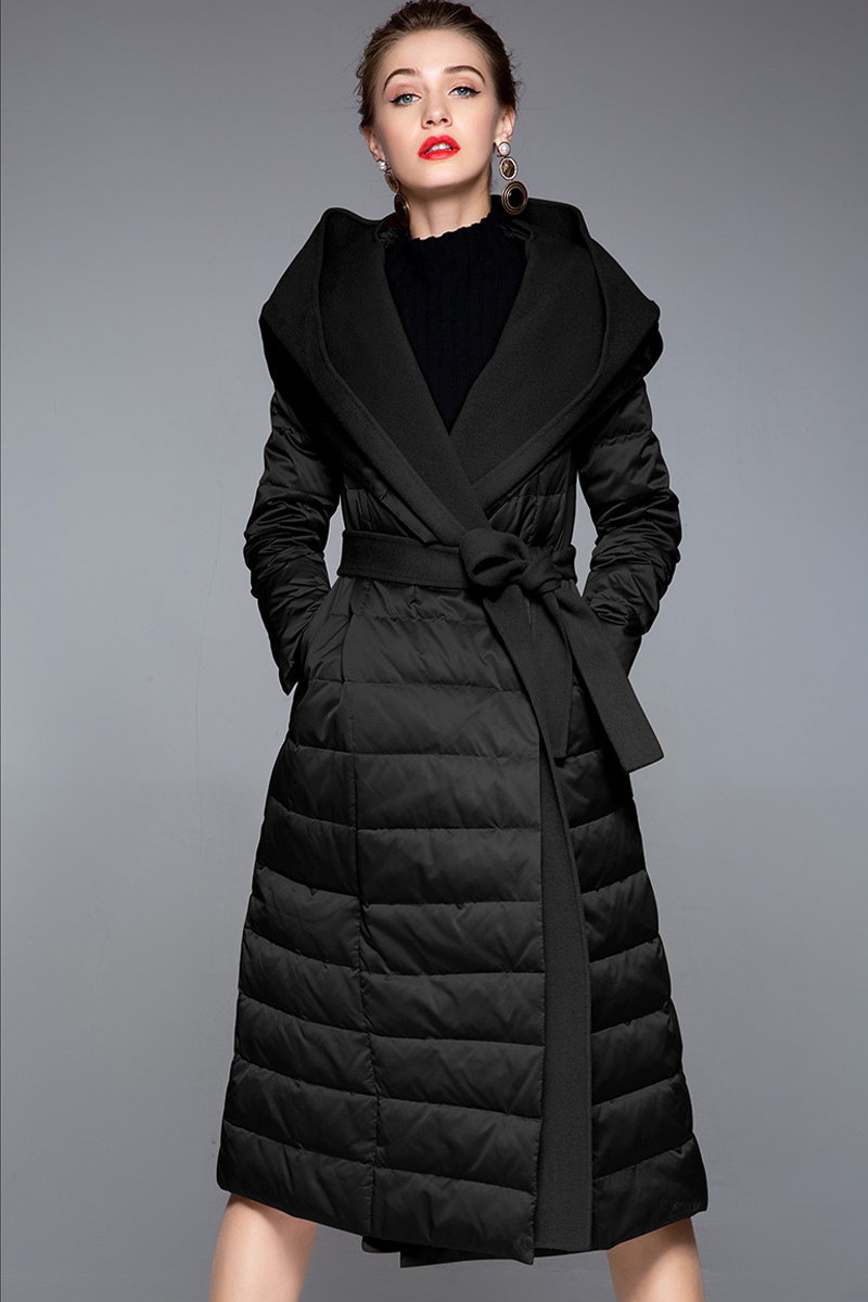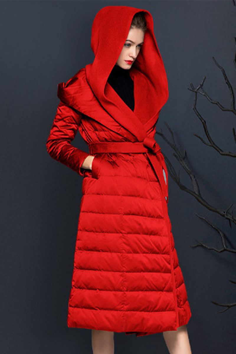 This is a medium to long lace up hooded thick down jacket. Self cultivating commuting style. White duck down filling, with a down content of 86% to 90%, and a down weight of 301-350 grams. Pocket style elegance. There are multiple colors to choose from.