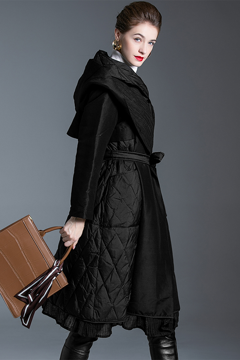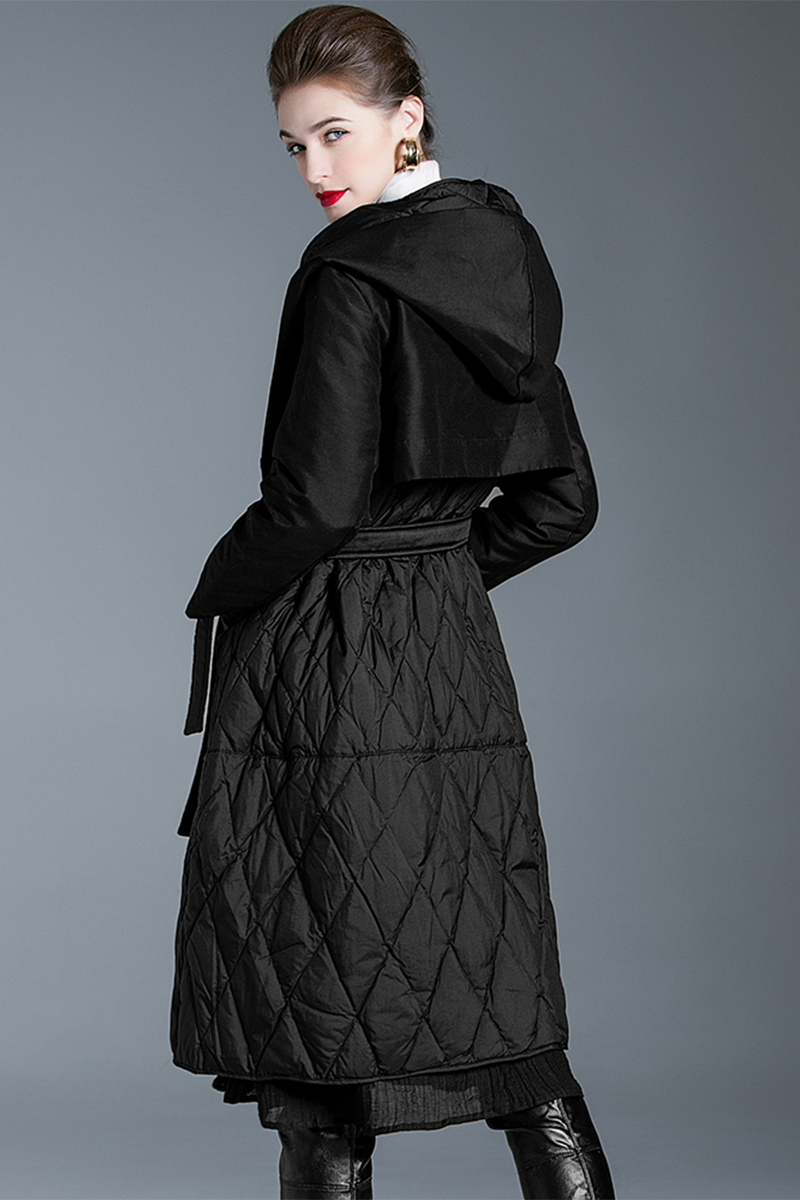 This is a diamond grid style lightweight slim fitting lace up down jacket. Hooded patchwork linen waist cinching for slimming commuting style. White duck down filling, with a down content of 86% -90%, and a down weight of 301-350 grams. Comfortable and casual with pockets.