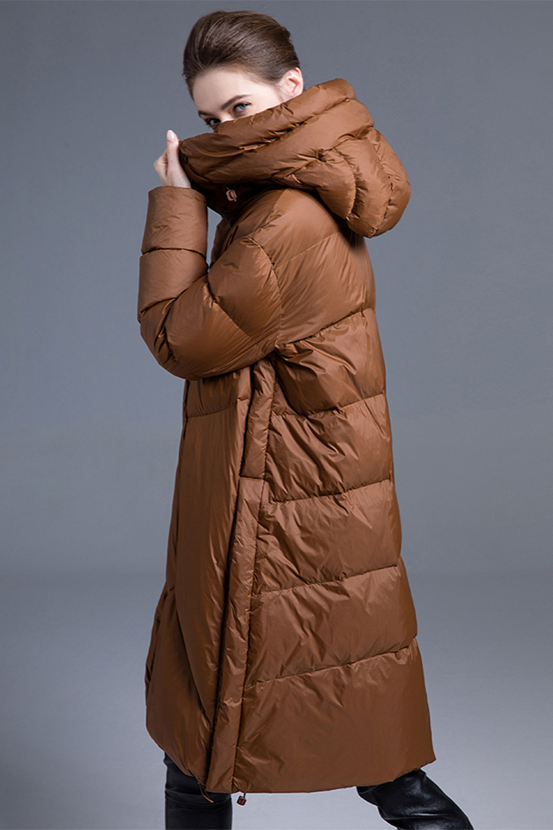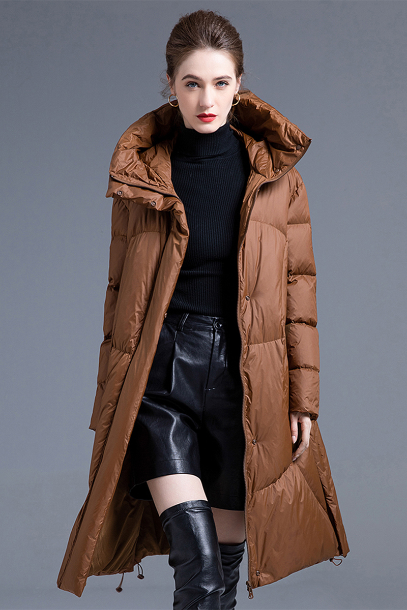 This is a medium to long hooded thick down jacket. A-shaped fashionable and personalized commuting style. White duck down filling, with a down content of 86% to 90%, and a down weight of 301-350 grams. Pocket style elegance. There are two colors to choose from.