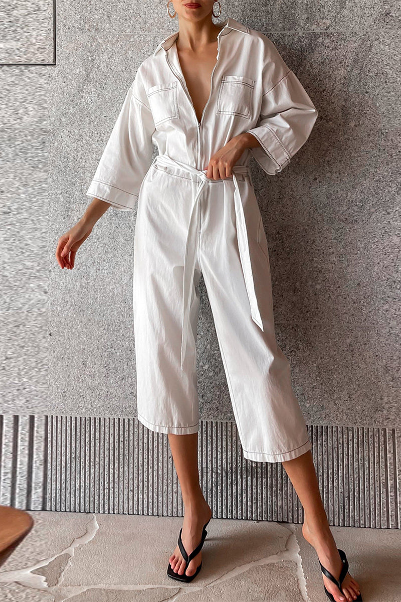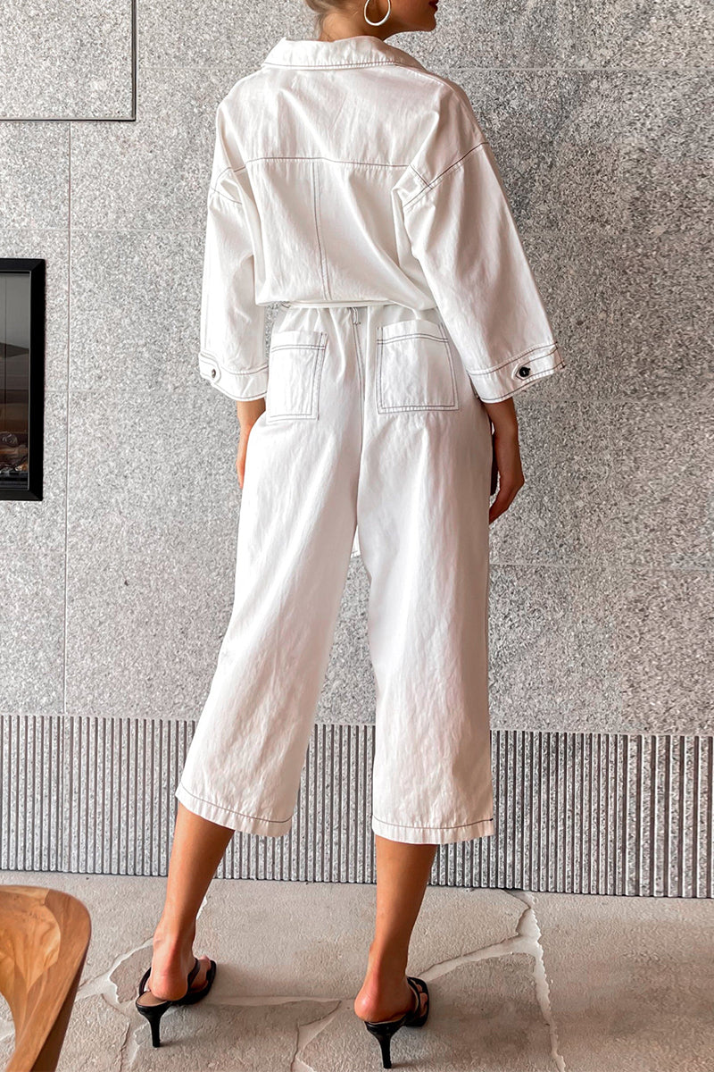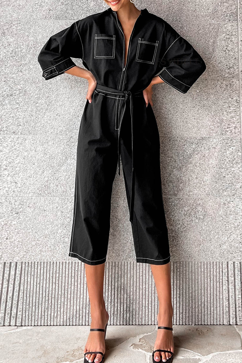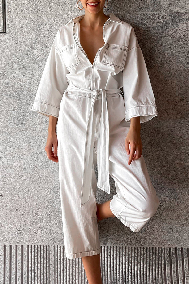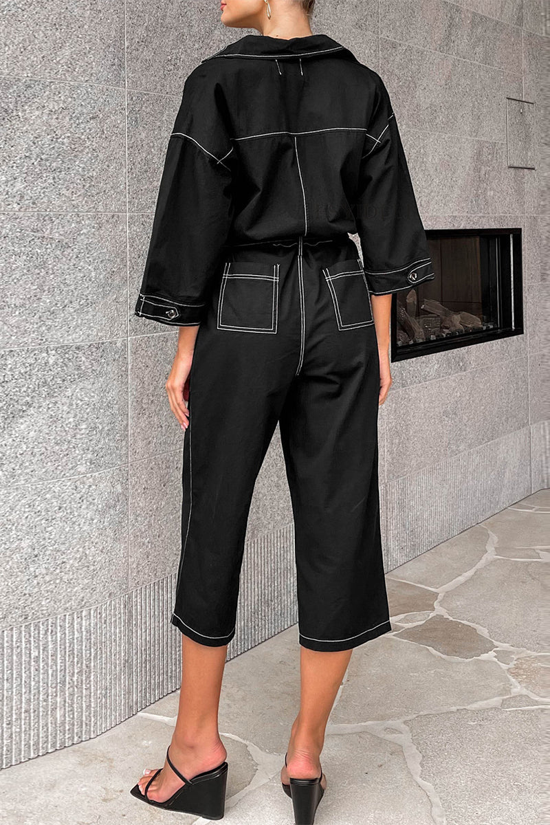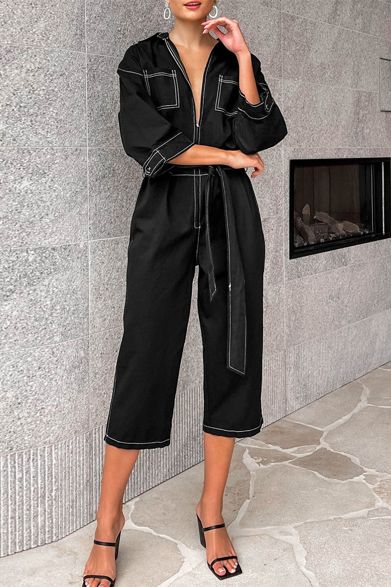 Monos holgados informales de color sólido con cordones y cuello vuelto de patchwork