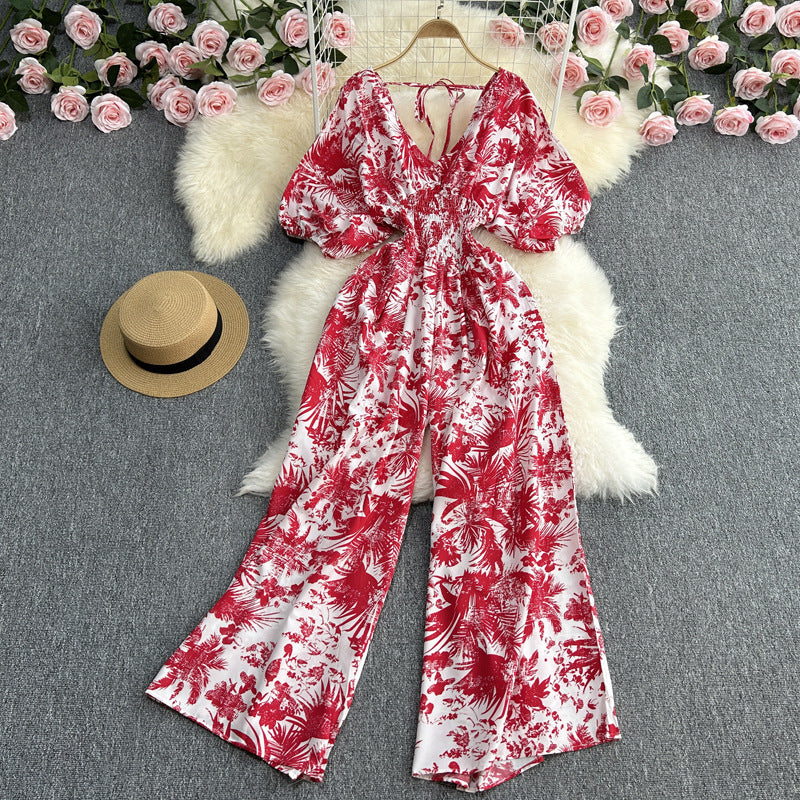 Mono elegante de manga corta con cuello en V, informal, de cintura alta, con estampado celadón, recto y pierna ancha para mujer.