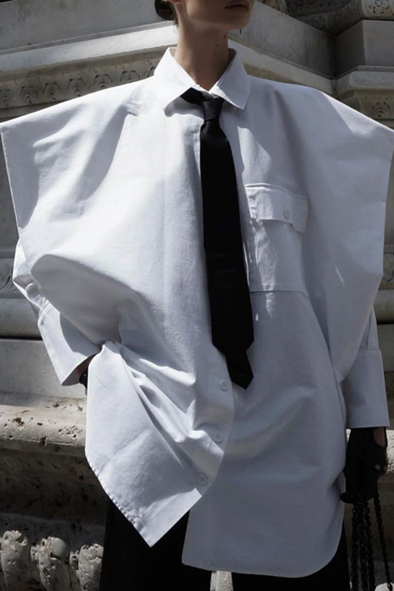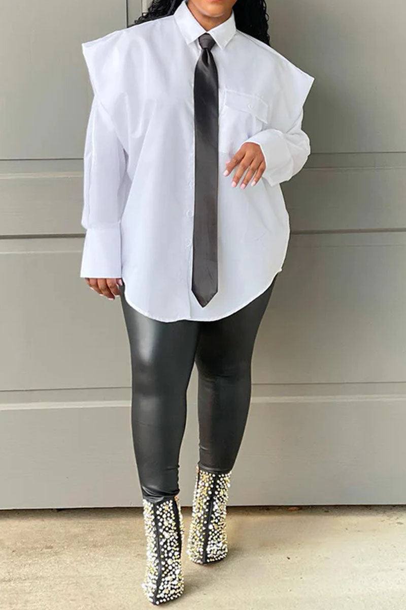 Elegant Solid Patchwork Pocket Buckle Shirt Collar Tops