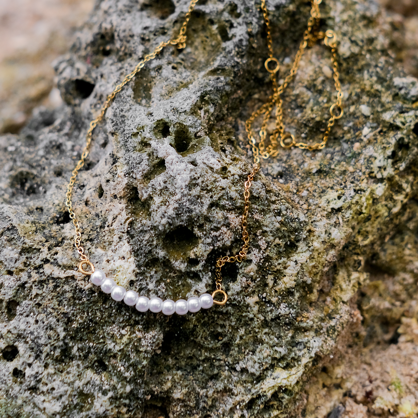 The Emilia Pearl Bar Necklace brings a modern twist to timeless elegance. Featuring a horizontal row of delicate freshwater pearls, this necklace adds a touch of sophistication to any look. Whether layeRed with other pieces or worn alone, its minimalist design effortlessly complements both casual and formal outfits. Crafted with a Gold-plated chain, this hypoallergenic and waterproof necklace ensures lasting beauty and comfort for everyday wear.
