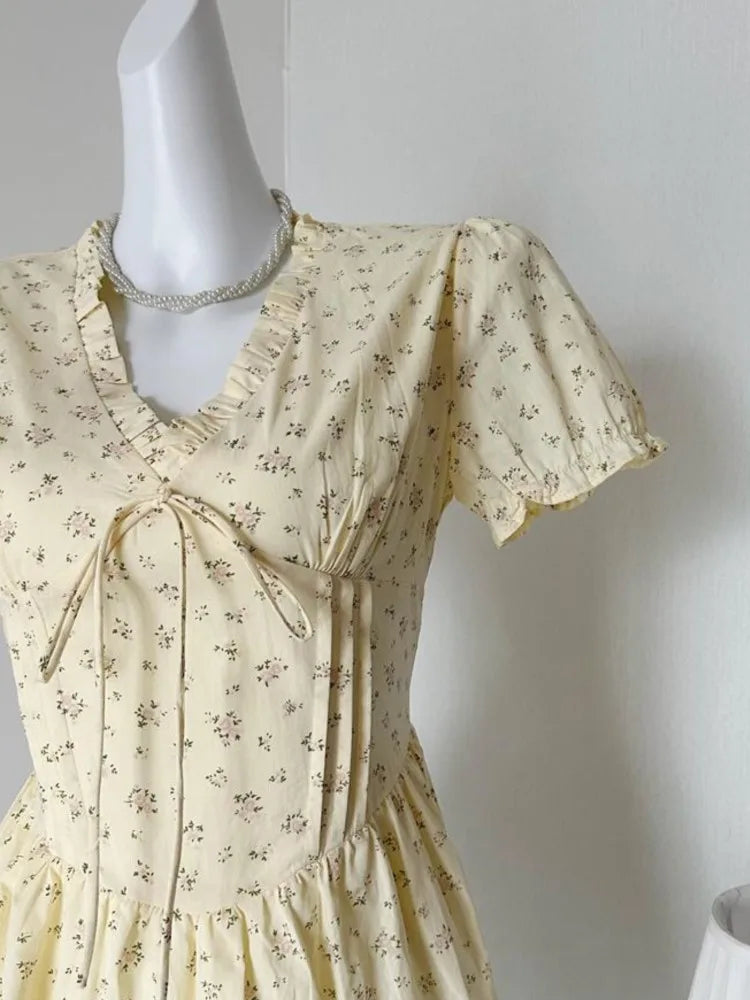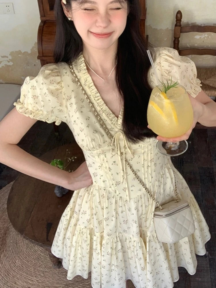 French Floral Printed Short Dresses for Women Y2K V-neck High Waist Birthday Party Dress Korean Chic Prom A-line Summer Vestidos
