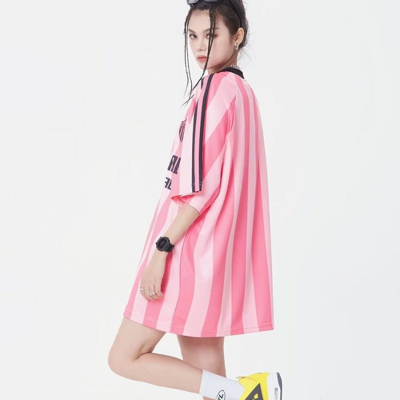 Camiseta deportiva holgada informal de manga corta con rayas rosas de estilo hip hop para mujer