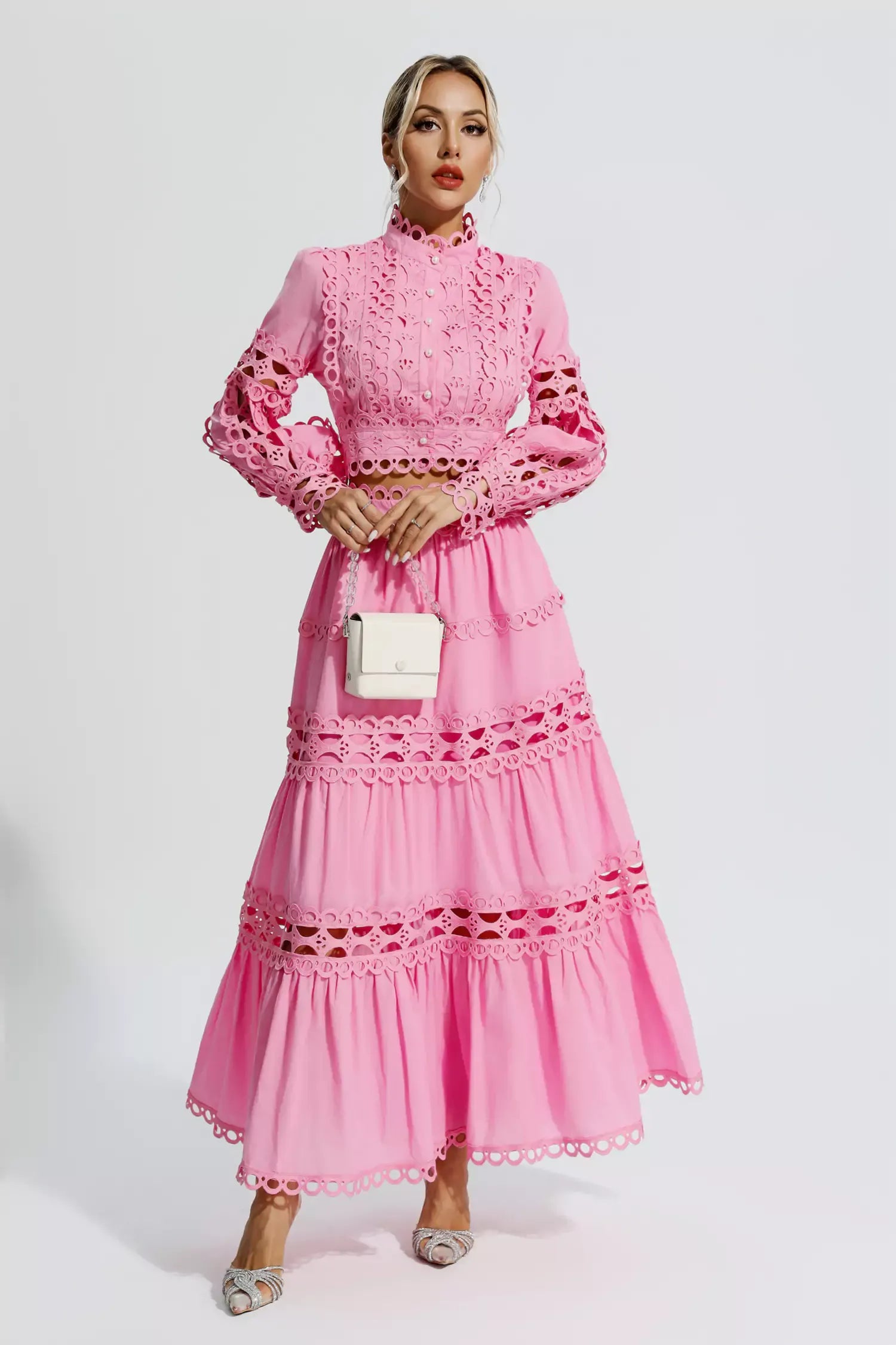 Upgrade your wardrobe with our Jimena Two Piece Set. The stylish cut out design and stand collar add a touch of elegance, while the lantern sleeves and high waist A-line skirt provide a comfortable fit. Made with quality materials, this solid set exudes fashion and confidence.