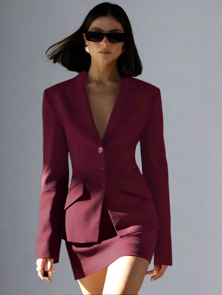 Elevate your wardrobe with the Jocelyn Two Piece Set, featuring an elegant long-sleeve single-breasted blazer paired with a slim, simple mini skirt. Crafted for a refined silhouette, this wine red ensemble combines sophistication with contemporary style, perfect for both professional settings and chic evening outings. The tailored blazer enhances structure while the skirt offers a sleek, flattering fit, creating a balanced and polished look that exudes confidence and grace.