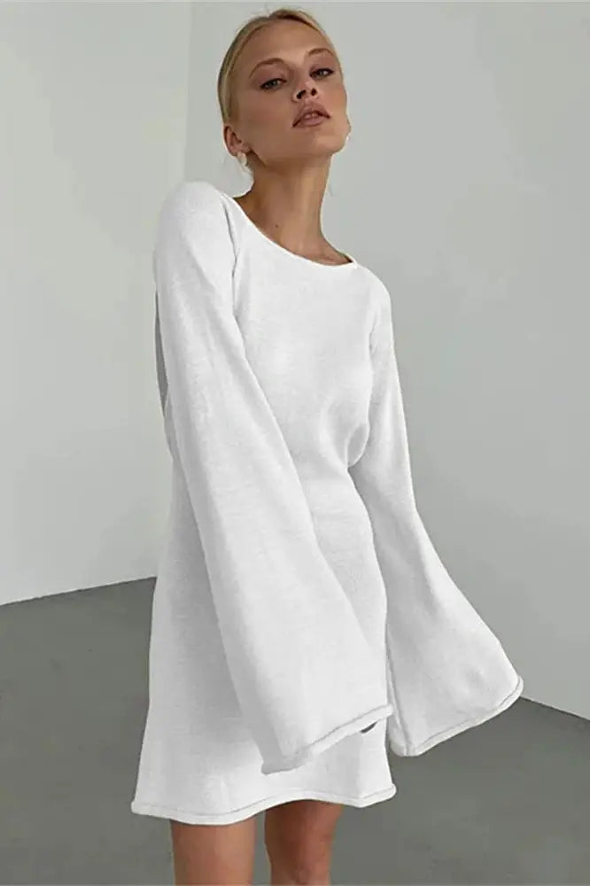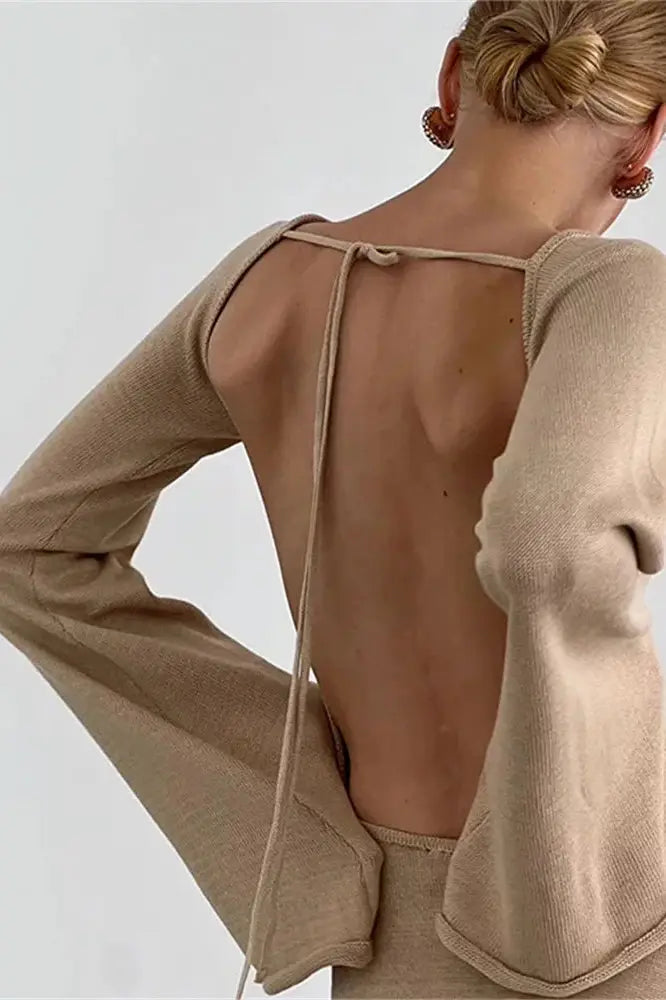 Step into sophistication with Backless Knitwear Lace-Up Mini Dress. Crafted with long sleeves and a loose fit. this dress exudes effortless elegance. Featuring a chic lace-up detail at the back.