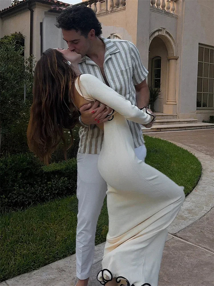 Knit Sweater Ruffled Long Dress Women Backless Fashion Ribbed Long Sleeve Elegant Party Dress Female Knitwear Autumn Dress