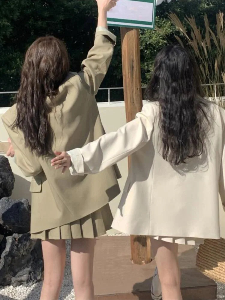 Korean Fashion Solid Two-piece Skirt Set Women Single Breasted Blazer Coat + Pleated Mini Skirt Autumn Office Lady Casual Suits