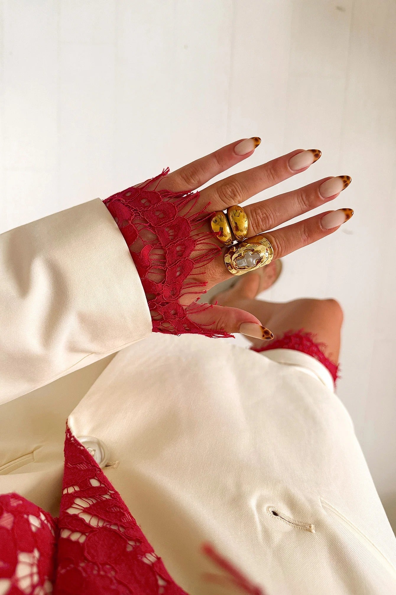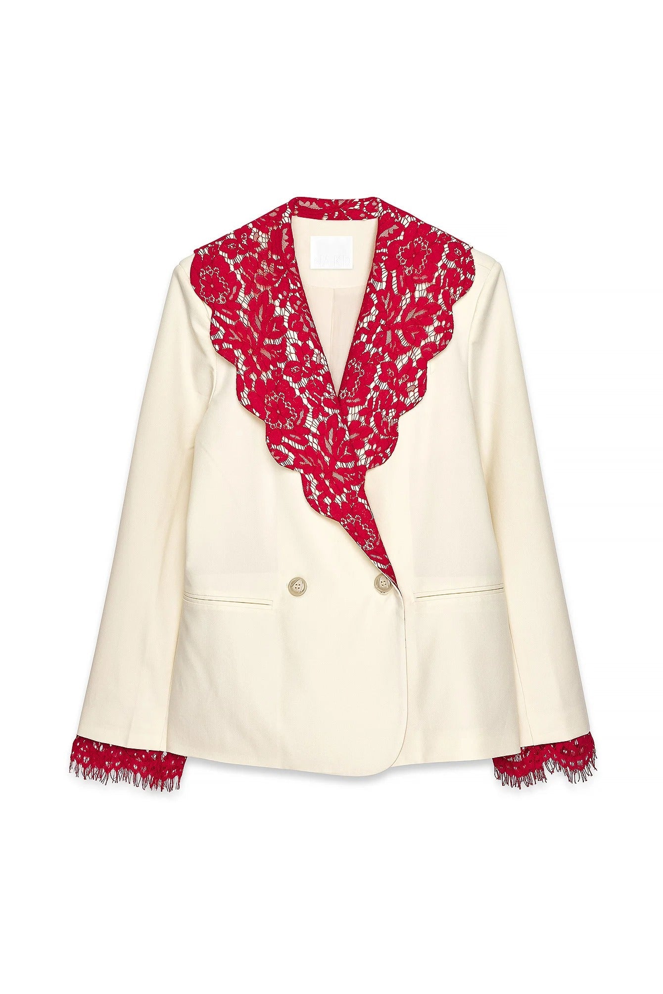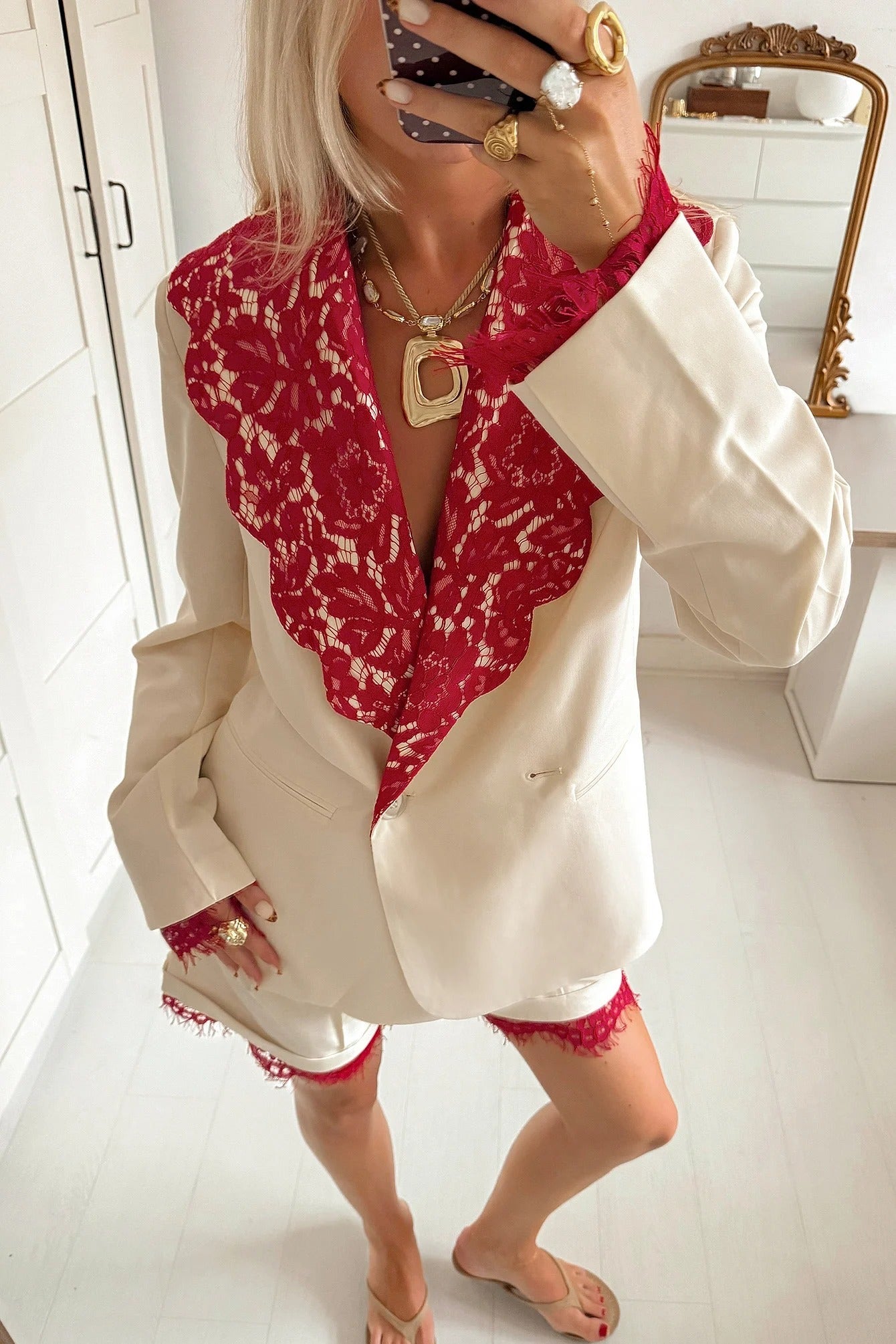 Una armoniosa combinación de sofisticación a medida y detalles románticos, este conjunto de blazer y shorts con detalles de encaje redefine el estilo moderno con un toque femenino. El tono blanco roto y los delicados adornos de encaje crean un look ideal tanto para fiestas en el jardín como para bodas o para elegantes conjuntos de día.