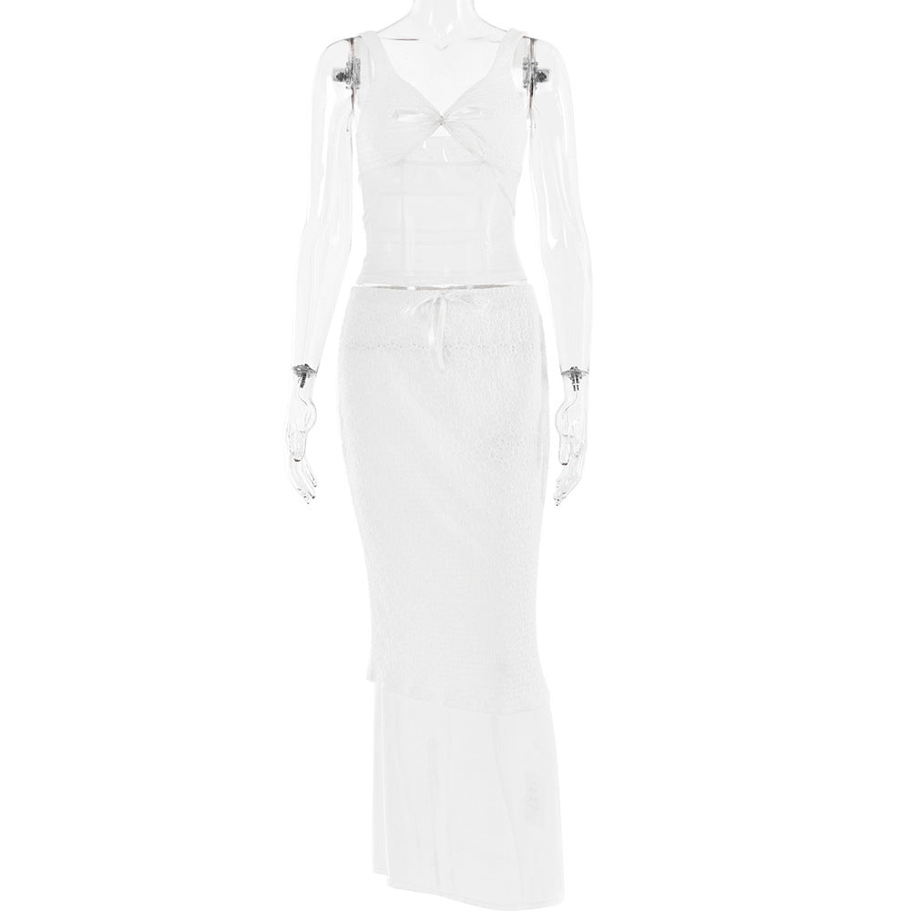 Lace Hook Floral Two Piece Sling Women Sexy Slim Fit Maxi Skirt Set Autumn