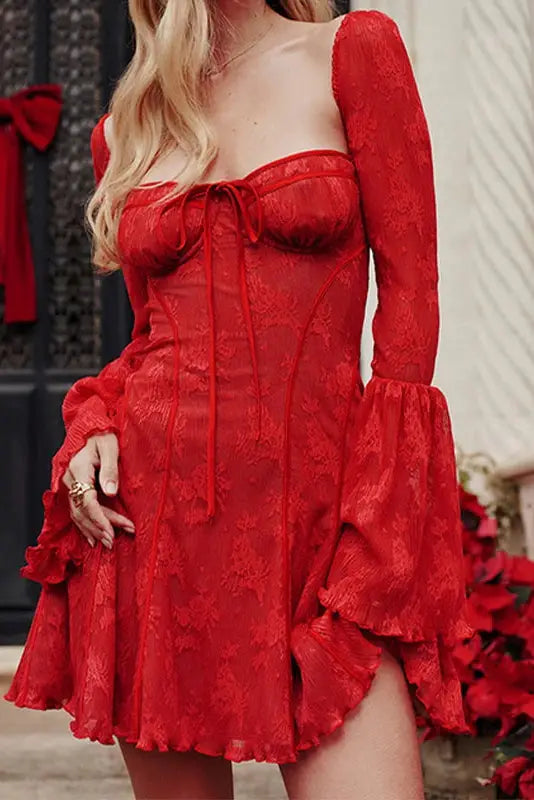 Make a statement in Backless Lace Mini Dress. featuring elegant flare sleeves and a fashion-forward square collar. This A-line silhouette exudes sophistication with its delicate lace detailing and alluring backless design.