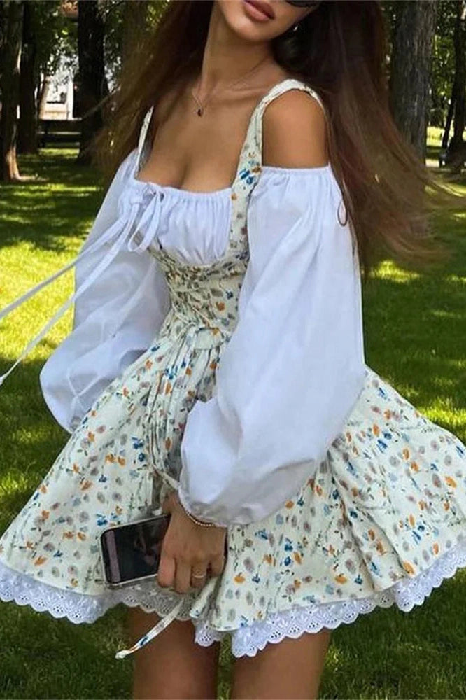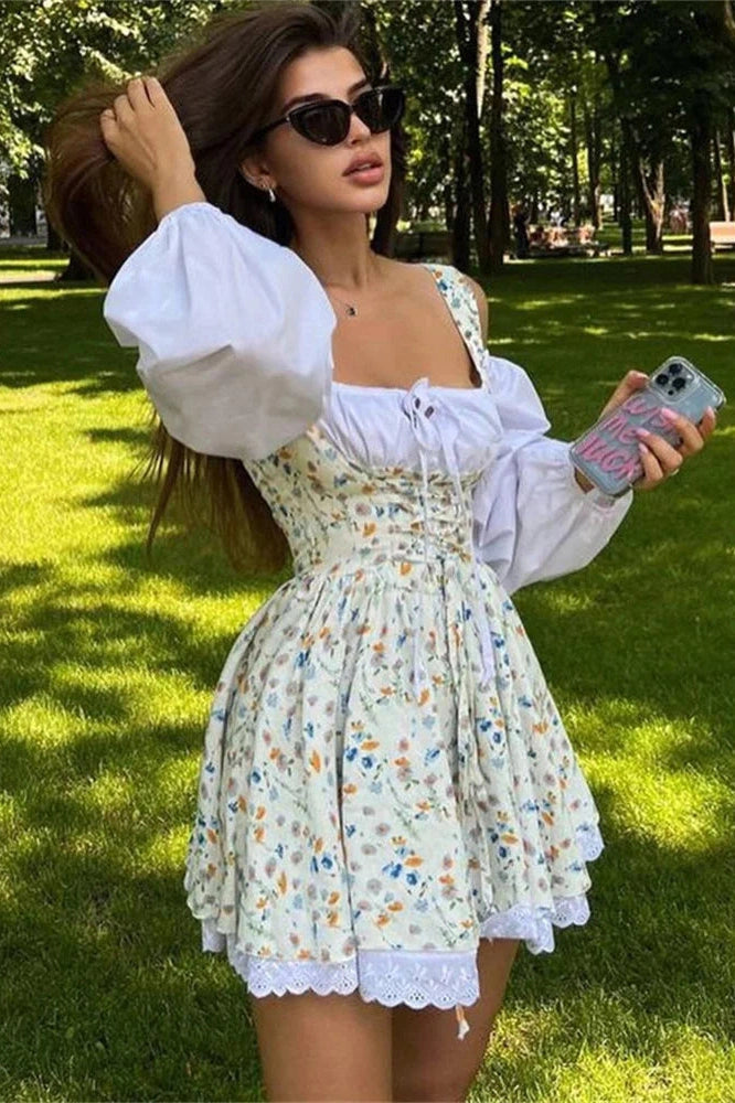 This charming mini dress features a stylish square collar and intricate lace patchwork. offering a fresh. playful look for any occasion.