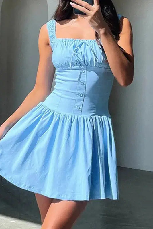 Embrace chic style with the Lace-Up Draped Mini Dress. Featuring a low chest design and lace-up detailing. this dress exudes allure and sophistication. The button accents add a touch of elegance.