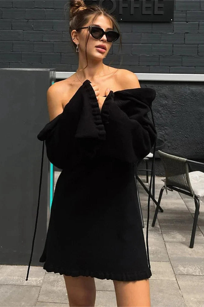 This chic mini dress features a backless design with lace-up detailing. long sleeves. and a flattering high waist for a bold. stylish look.