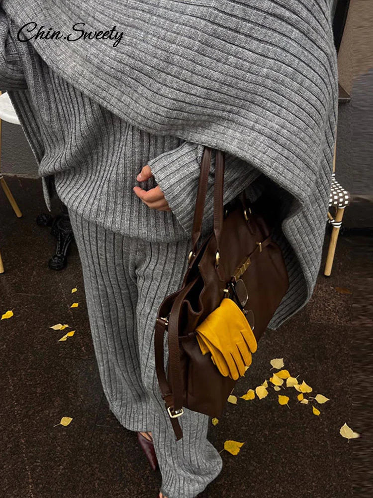 Lazy Loose Knit Burgundy Red Pant Set With Scarf Women Long Sleeve V-neck Jumper Wide Leg Full-length Pants Suit Lady Outfits