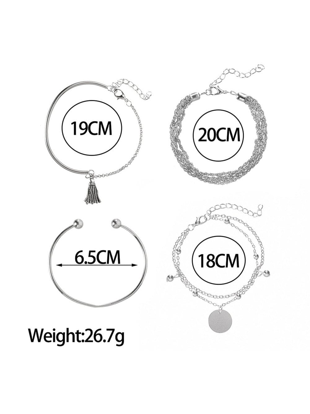 Enhance your style with this exquisite Multilayer Chain Disc Tassel Pendant Silvery Bracelet Set. Perfect for adding a touch of bohemian flair to your look, this set is a must-have accessory for any fashion-forward individual.
