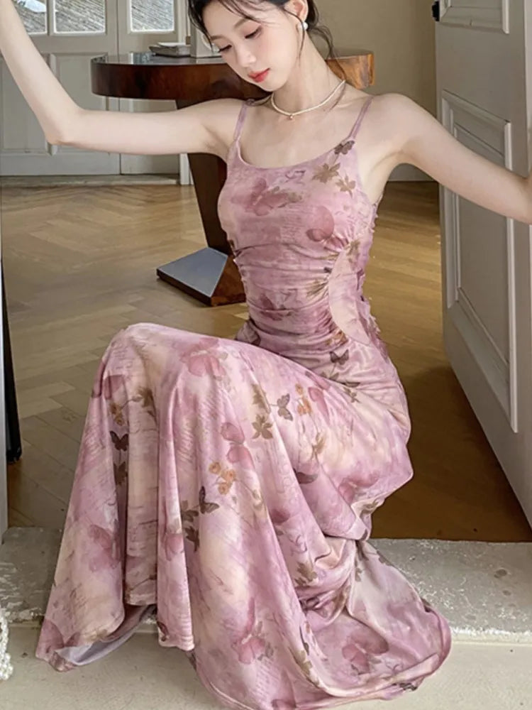 Sexy Printed Long Dresses for Women Mesh Spaghetti Strap Slim A-line Party Dress Summer Korean Fashion One Piece Vestido Mujer