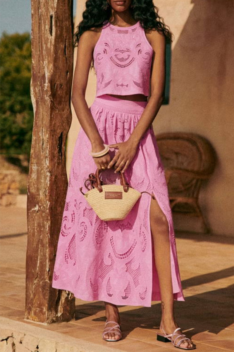 Sexy Vacation Hollow Out Slit Embroidery O Neck Sleeveless Two Pieces