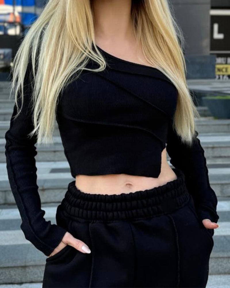 Sloping Neck Stitching Long Sleeve T-Shirt