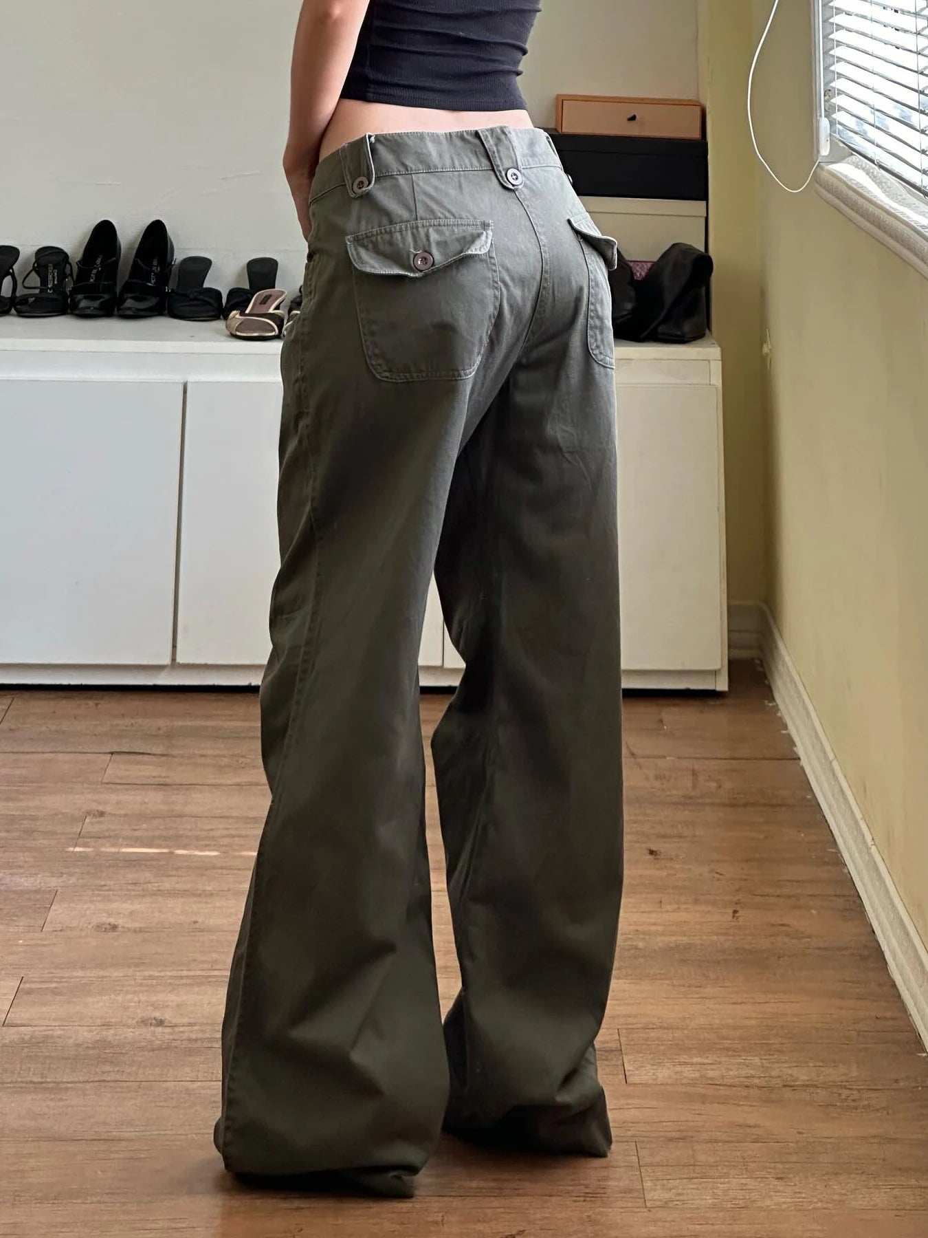 Sweetown Retro Green Low Rise Straight Jeans Woman Y2K Streetwear Denim Trousers Pockets Casual Cargo Jean Pants