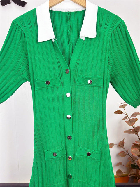 V-Neck Knit Contrast Long Dress Women Hollow Out Lapel Fashion High Waist Elegant Party Dress Knitwear Ladies Maxi Dress