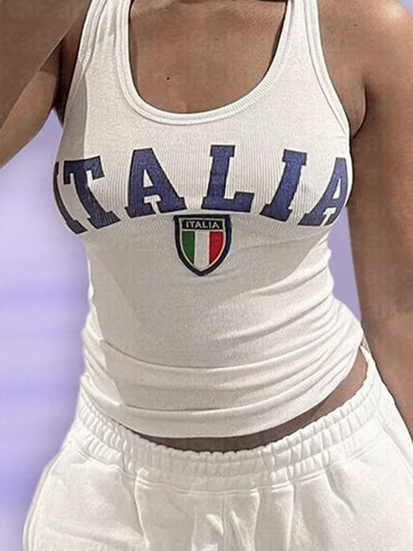 White Vintage Letter Print Embroidery U Neck Tank Top