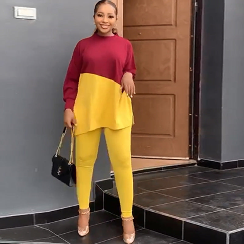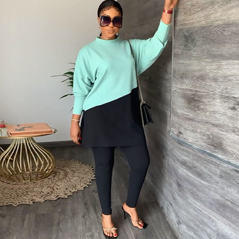 Conjunto de dos piezas de sudadera y pantalones casuales de manga larga, cuello redondo y bloques de color para mujer