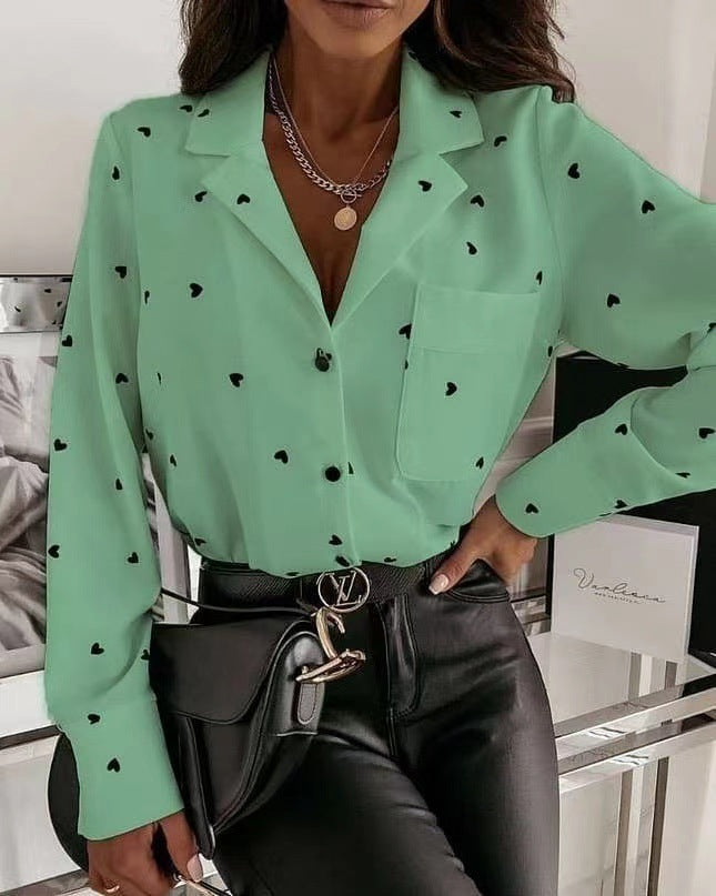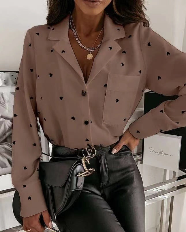 Camisa informal holgada de manga larga con cuello en V y estampado de corazón para mujer