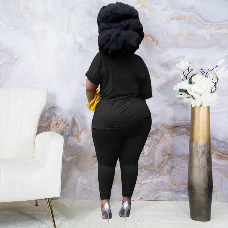 Conjunto de dos piezas para mujer, informal, de talla grande, color liso, con escote en V, camiseta holgada con abertura y pantalones ajustados