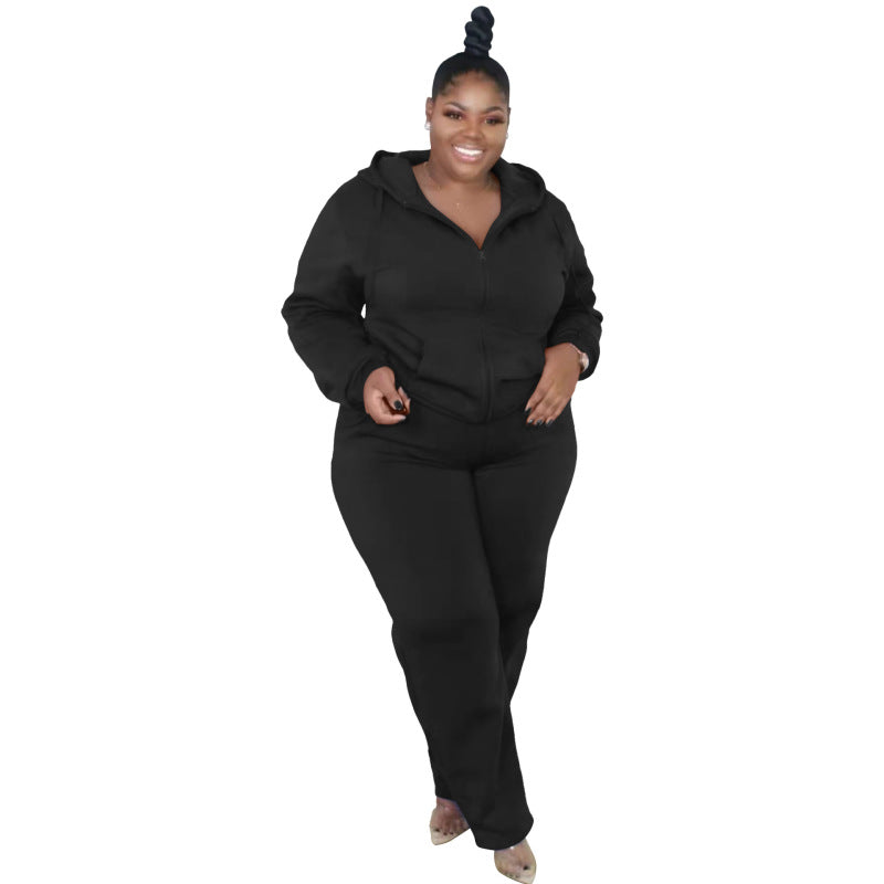 Conjunto de dos piezas de sudadera con capucha y pantalones de manga larga con cremallera y talla grande de color liso informal para mujer