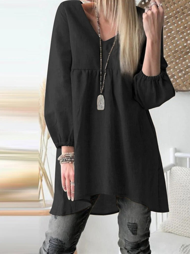 Camisa informal de color liso con cuello en V y mangas abullonadas para mujer
