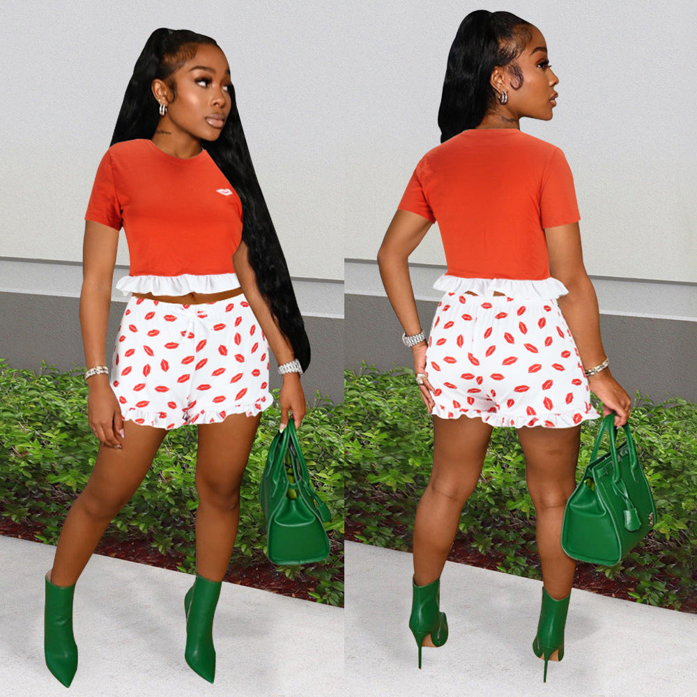 Women Clothing Summer Lace Color Matching Short-Sleeved T-shirt Women Lip Printings Slim Two-Piece Set Romper