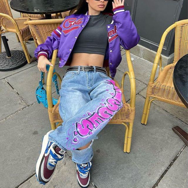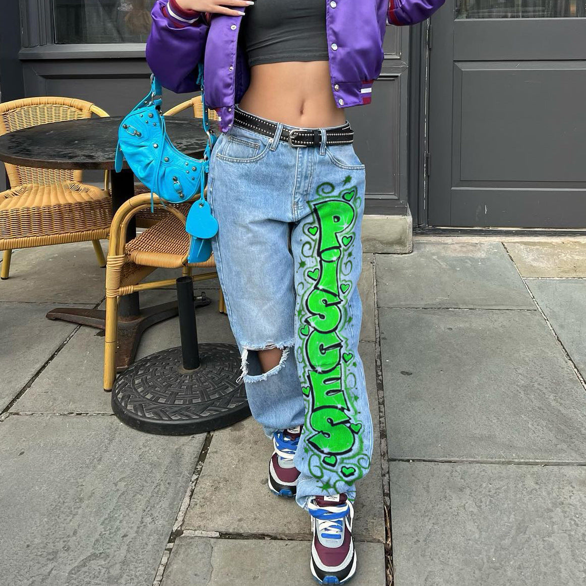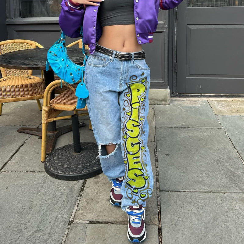 Vaqueros de pierna ancha con estampado de letras rasgadas e informales para mujer