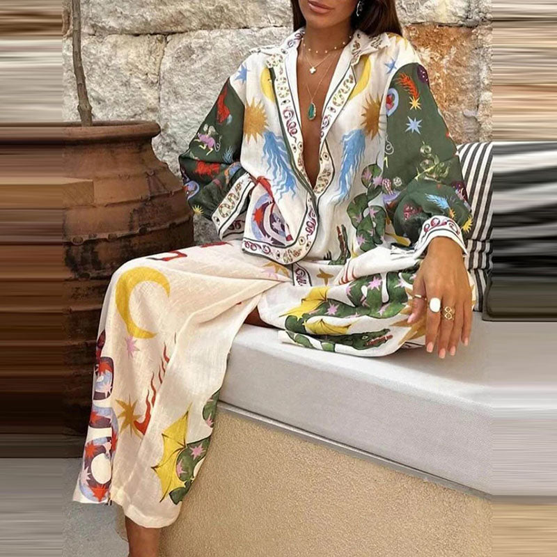 Conjunto de dos piezas formado por camisa, pantalón y top de manga larga con solapa y estampado gráfico informal para mujer