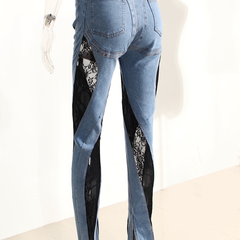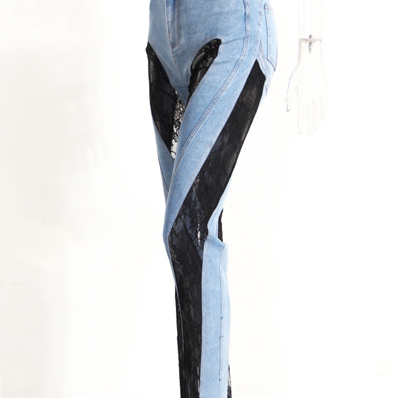 Vaqueros rectos de cintura alta con encaje y retazos informales a la moda para mujer