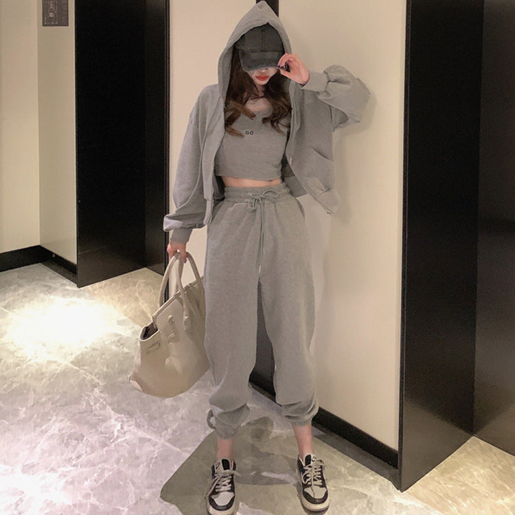 Conjunto de 3 piezas de camisola informal de color liso con cremallera y sudadera con capucha y cordón ajustable en la cintura para mujer