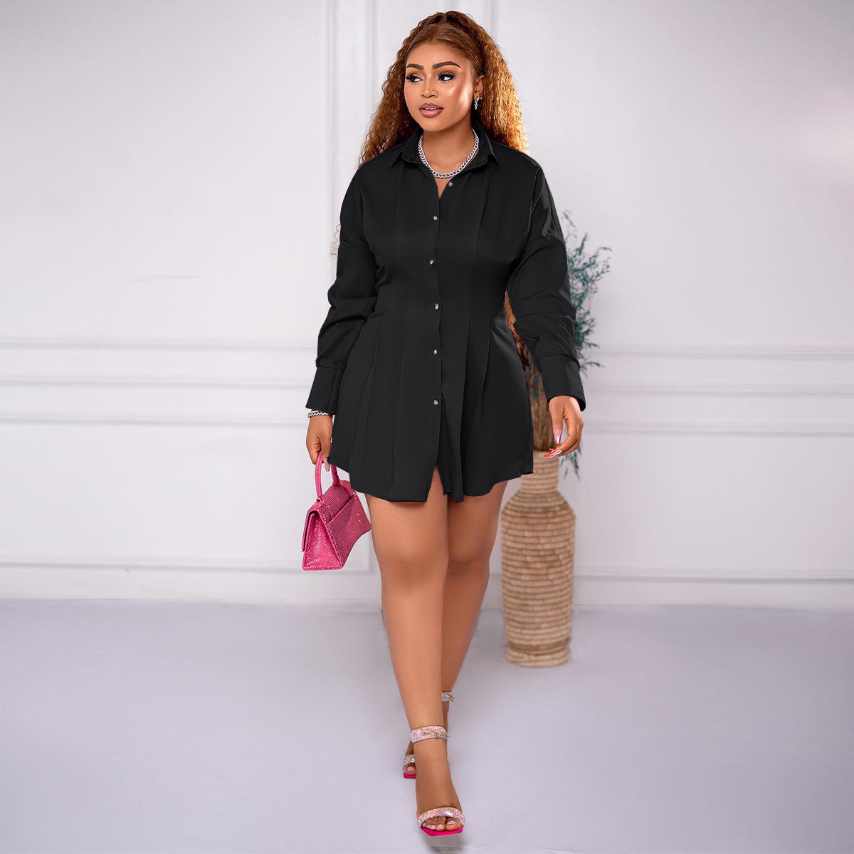Vestido camisero ajustado de manga larga con solapa y color liso informal a la moda para mujer