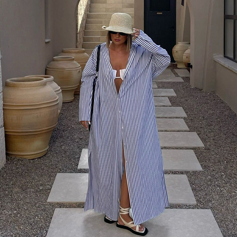 Camisa informal de manga larga con solapa y rayas para mujer, con un solo pecho