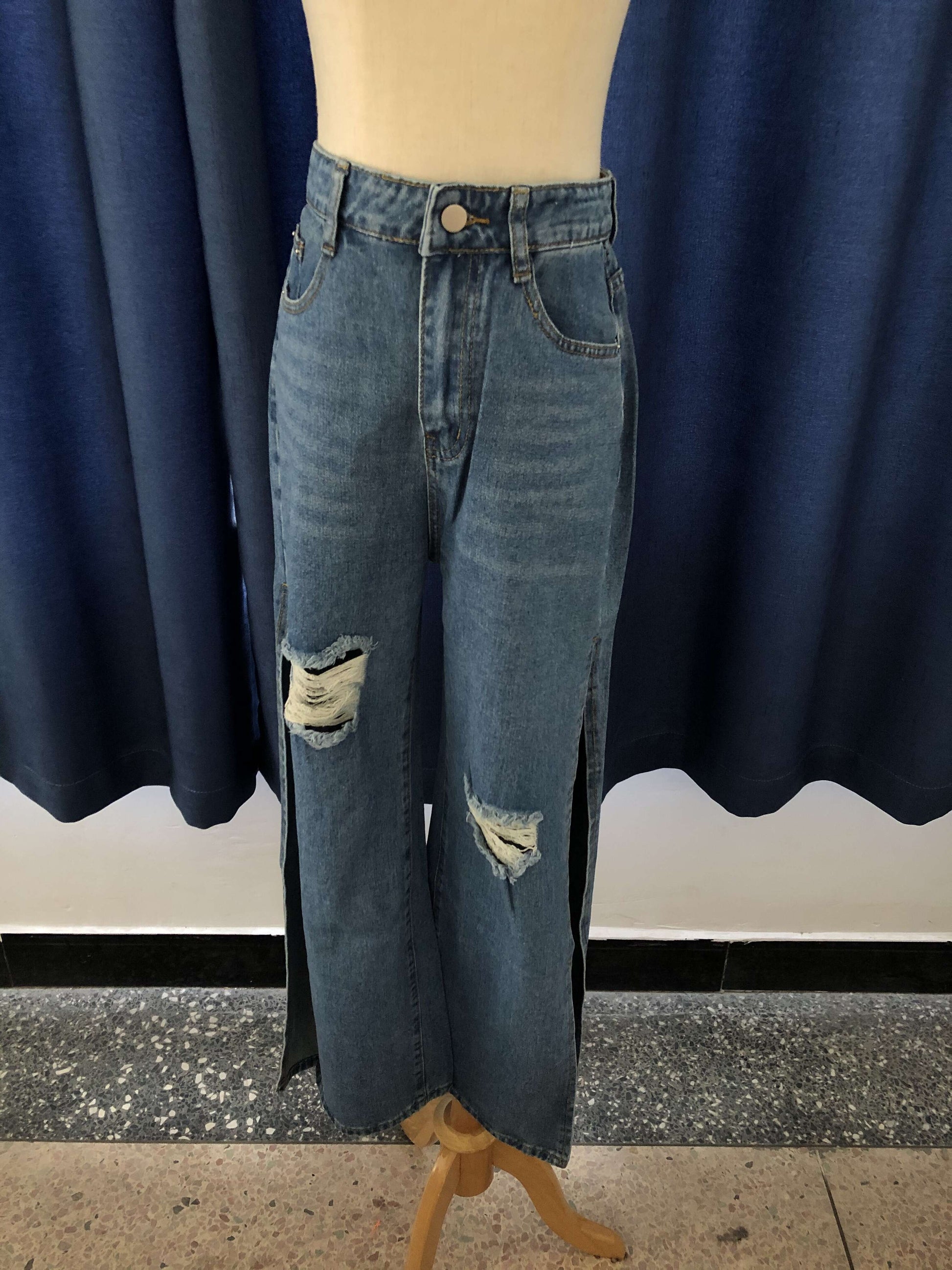 Vaqueros de pierna ancha, holgados, rasgados, con aberturas laterales, elegantes e informales, a la moda para mujer